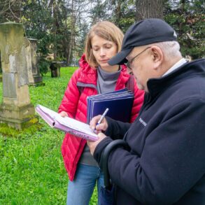 – Anita Zontek, wiceprezes Stowarzyszenia Wyznaczamy Nowe Kierunki i wolontariusz Damian Radziak – Stowarzyszenie w tej chwili odpowiada za organizację akcji społecznych na cmentarzu,